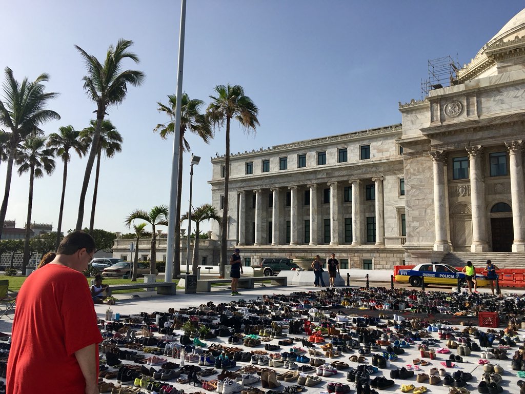 Román, como otros cientos de personas que han desfilado por el lugar para testimoniar su dolor por las víctimas del huracán María, que devastó a Puerto Rico el 20 septiembre de 2017, manifestó que los familiares ni siquiera han podido guardar luto. “La rabia que siento es porque nosotros teníamos derecho a llorar a nuestros muertos y el gobierno nos quiso quitar ese derecho, al igual que el derecho a guardar luto y eso da rabia y sentido de impotencia”, sostuvo. La protesta silente, solo evidenciada por los cientos de pares de zapatos de diversas formas, colores y tamaños, incluso de bebés, fue una iniciativa de un grupo de personas, entre estas el poeta Rafa Acevedo y la periodista Laura Candelas, luego de que el gobierno de Ricardo Rosselló mostrara resistencia a aceptar la cifra de 4,645 víctimas directas o indirectas de María, debido al colapso del sistema eléctrico, la telefonía y los centros hospitalarios, entre otros servicios esenciales.