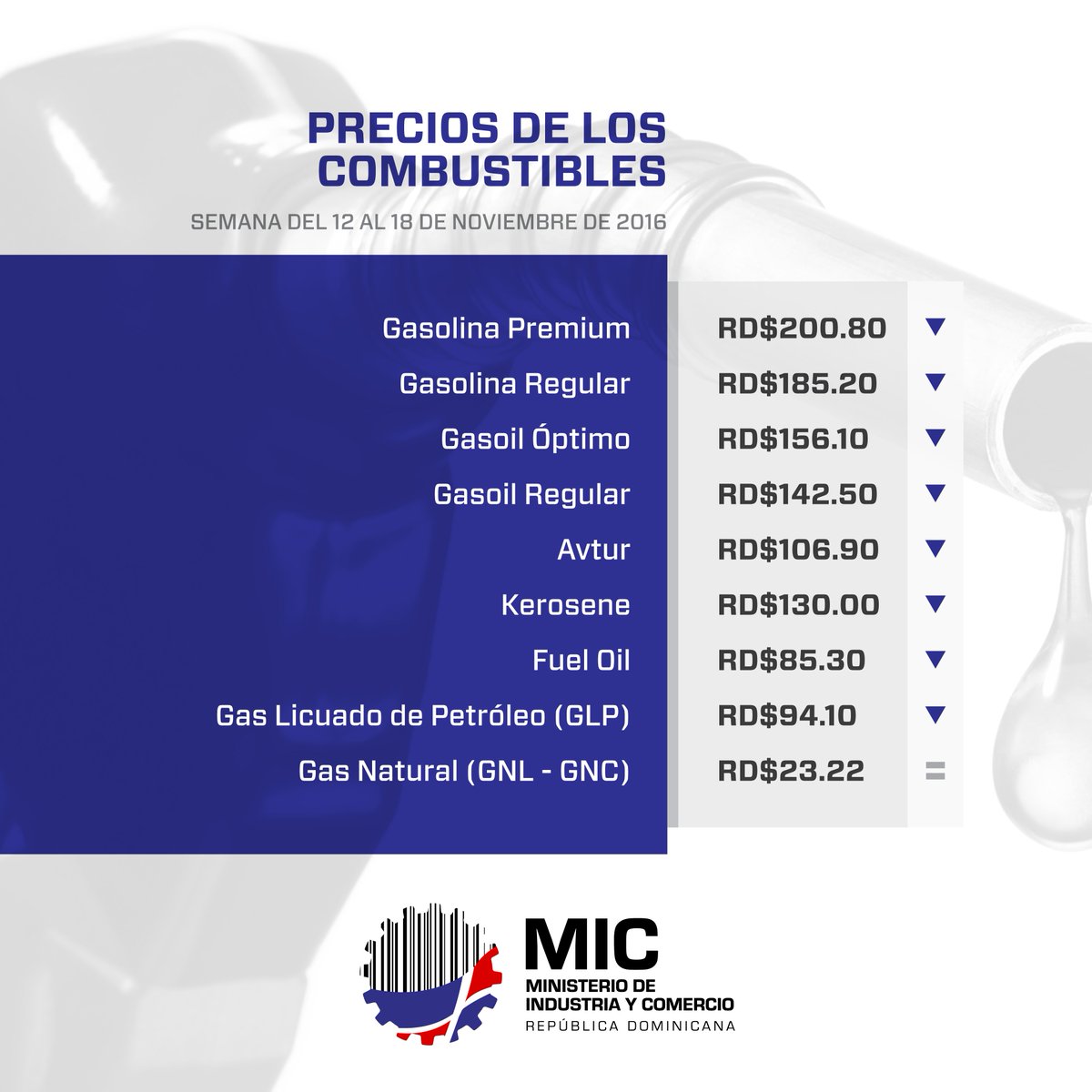 Todos los combustibles, con excepción del gas natural, rebajan sus precios para la semana del 12 al 18 de noviembre de 2016, por disposición del Ministerio de Industria y Comercio (MIC).