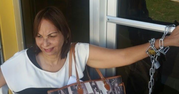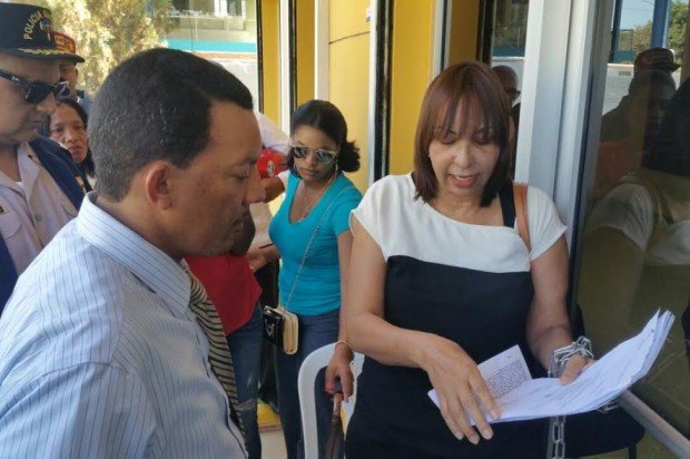 Dajabón.- Una mujer con dificultades para caminar se encadenó en la puerta principal del Banco Agrícola en esta ciudad, alejando haber sido estafada por la institución y un subdirector del Proyecto Agrario La Cruz de Manzanillo con un acuerdo de ventas de una propiedad.